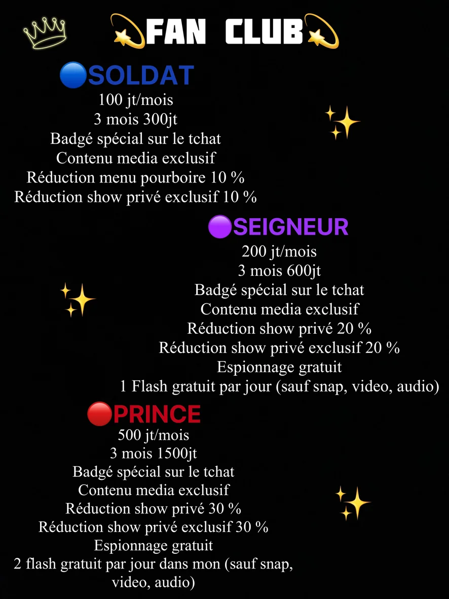 De nature très perverse, joueuse et provocante, je mène mes lives comme un jeu de pouvoir 😏 Ici, tout se mérite… 💰 Aucune demande sans tokens • Pas de “tu peux… ?” sans pourboire • Le désir passe par la générosité 📜 Tout est clair et assumé • Tout ce que je pratique est indiqué dans le menu pourboires • Si ce n’est pas affiché → je ne le fais pas • Pas d’exception, pas d’insistance 🎲 Les hommes joueurs et généreux sont les bienvenus • J’aime ceux qui savent prendre des risques • Ceux qui aiment me provoquer, me stimuler et me faire perdre le contrôle 🔥 • Plus tu joues, plus je me dévoile… ✨ Ici, on récompense les vrais joueurs. Les timides regardent. Les généreux s’amusent. 😈💎